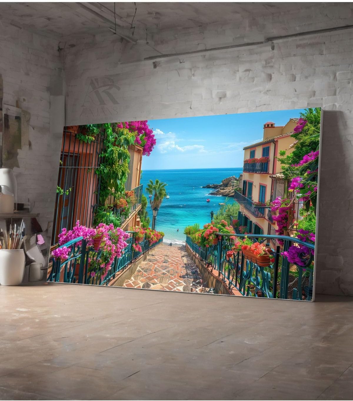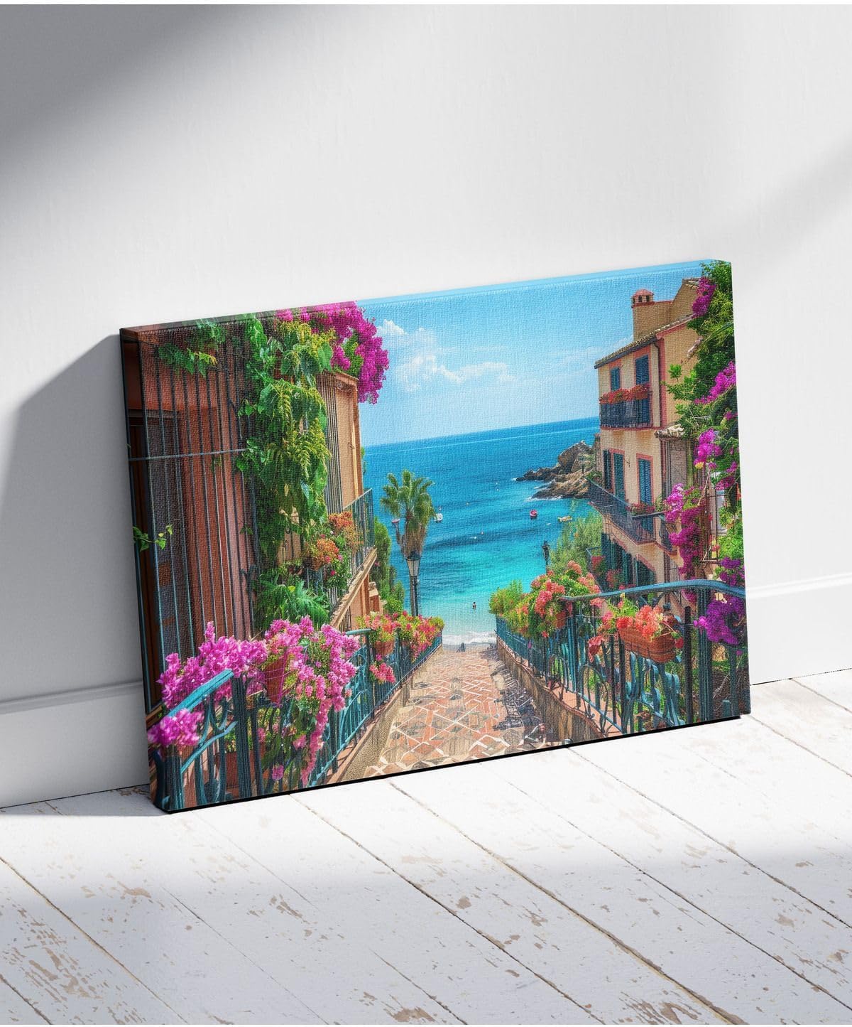 Ar Ajans Kanvas Tablo Denize Huzura Açılan Pembe Çiçekli Merdivenler Dekoratif Kanvas Tablo 80 X 120