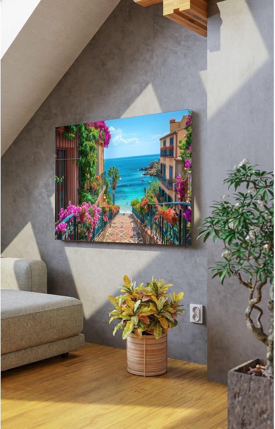 Kanvas materyali sayesinde uzun ömürlü ve kaliteli bir kullanım sunar; Doğa temalı tasarımı ile mekanınıza huzur ve sakinlik katar; Pembe çiçeklerin ve merdivenlerin zarif kompozisyonu, dekoratif bir dokunuş sağlar;